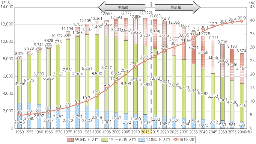 ――特に問題とされているのが、労働人口の減少です。出生率は年々減少しており、高齢者は増えるばかり。グラフを見ても分かる通り、1990年頃をピークに労働人口は年々減少しています。
